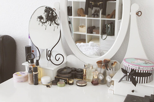 * Bem, na penteadeira você pode colocar seus pincéis em um copinho fofo, suas maquiagens e caixinhas guardando seus acessórios como na imagem abaixo: